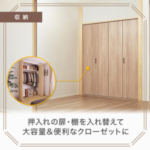 押入れは、扉を替えるだけでクローゼット化できる場所。奥行きを活かせば大きな収納力を確保でき、棚を取り外してハンガーパイプや可動棚を設置すれば、ぐっと使いやすくなります。