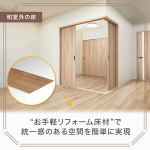 畳をフローリングに替えると、リビングなど他の部屋とのつながりも気になるところ。そんな時に便利なのが“上貼り式”の床材。既存の床を残したまま施工できるので、住みながらリフォーム可能です。