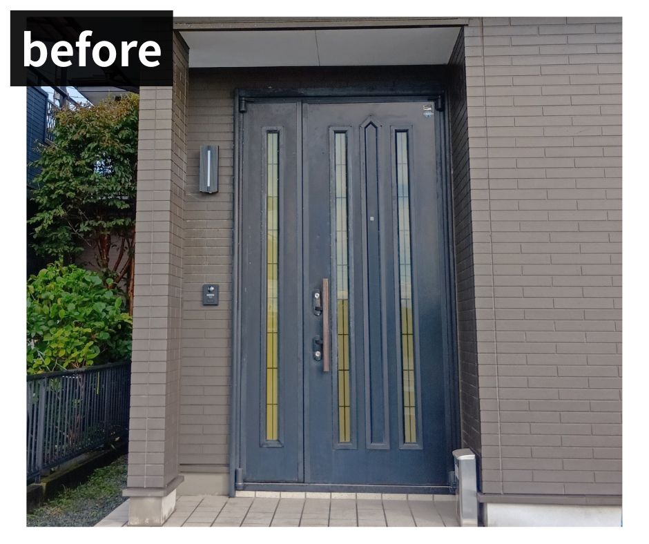 西日の影響で表面が劣化した玄関ドアを、LIXIL「リシェント 高断熱仕様」〈クリエモカ〉へ交換しました。